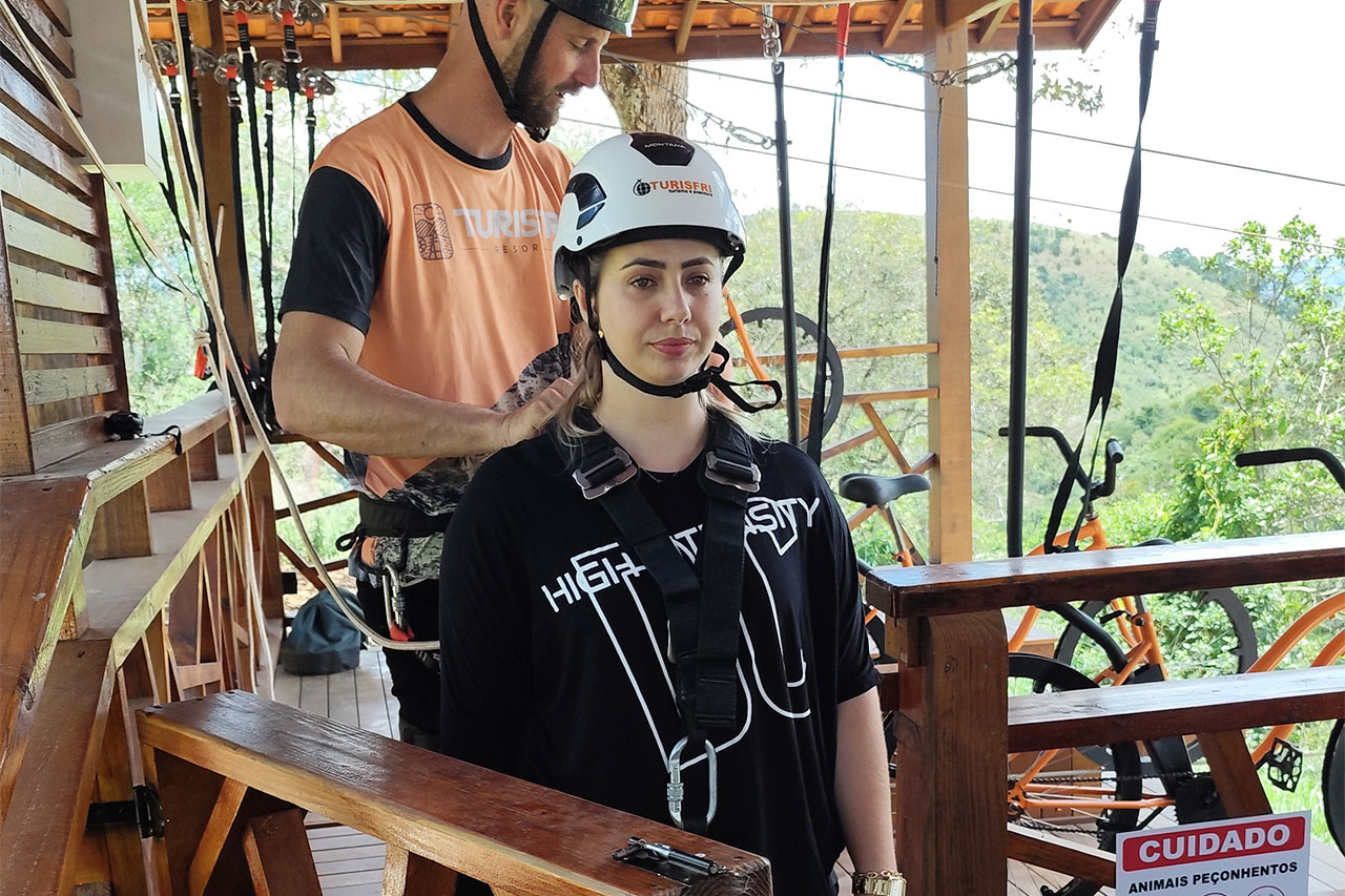 Sim, é seguro. Nosso primeiro procedimento é prender o cliente em cabos de segurança na Fita "Y" que está conectada aos cabos de aço. Após a liberação do condutor, ele é lançado da plataforma.